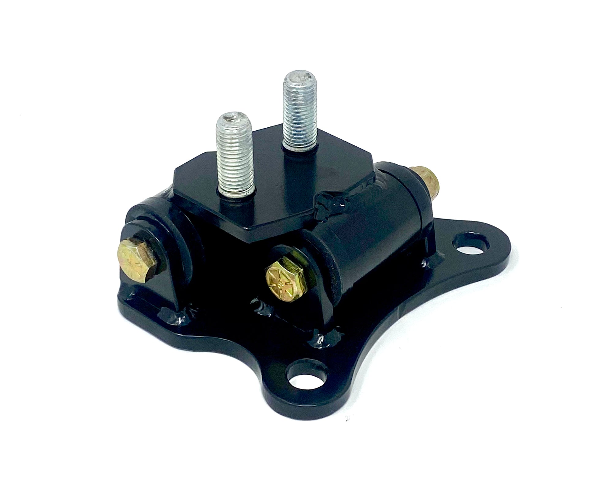 Utilizes two polyurethane bushings in compression rather than shear force like the problematic OEM mount. Heavy duty steel construction, hand TIG welded. Powder-coated satin black for durability.